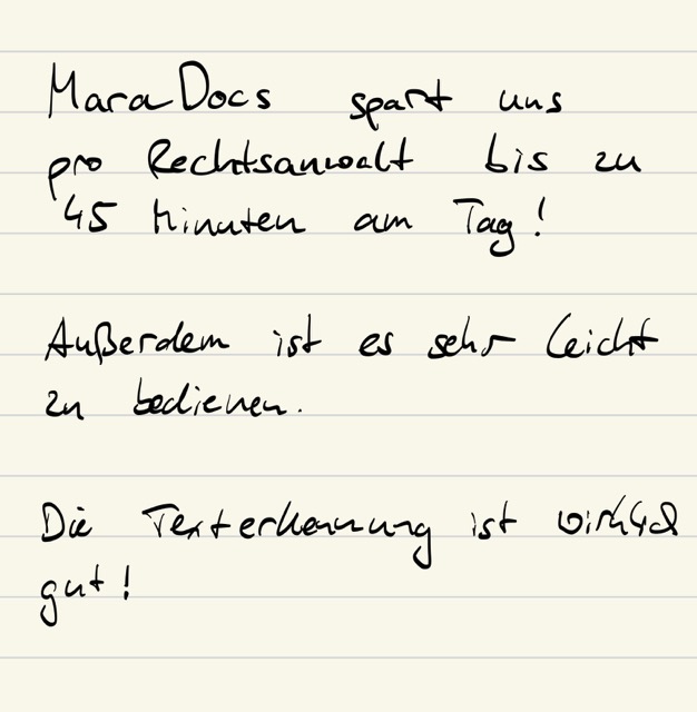 MaraDocs setzt eine fortschrittliche KI-Texterkennung (OCR) ein. Ein jedes Eingangsdokument wird auf Wunsch automatisch zu einer PDF, bei der der enthaltene Text auswählbar ist. Das können PDFs sein, Bilder von klassischen Dokumenten oder auch handschriftliche Notizen.